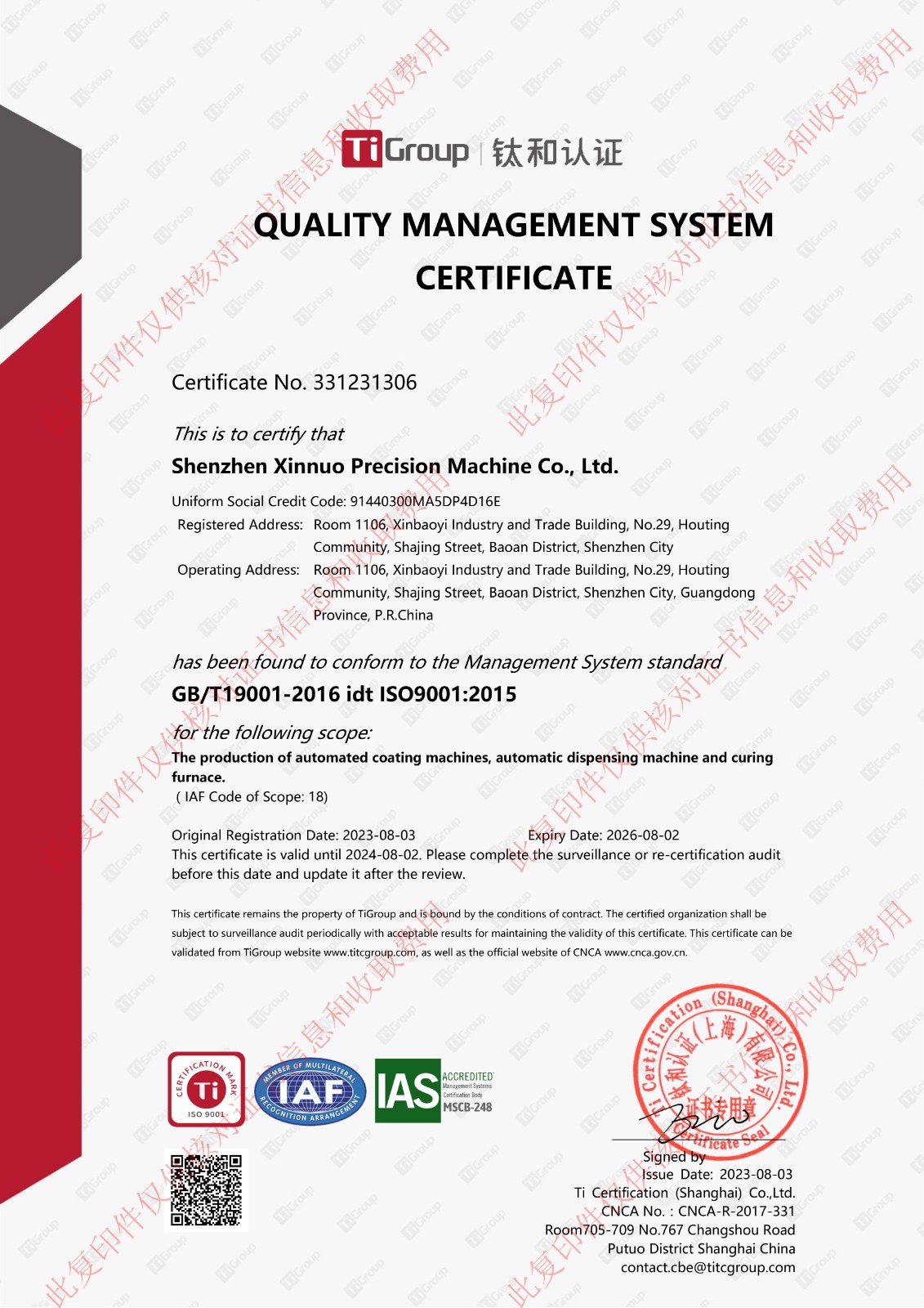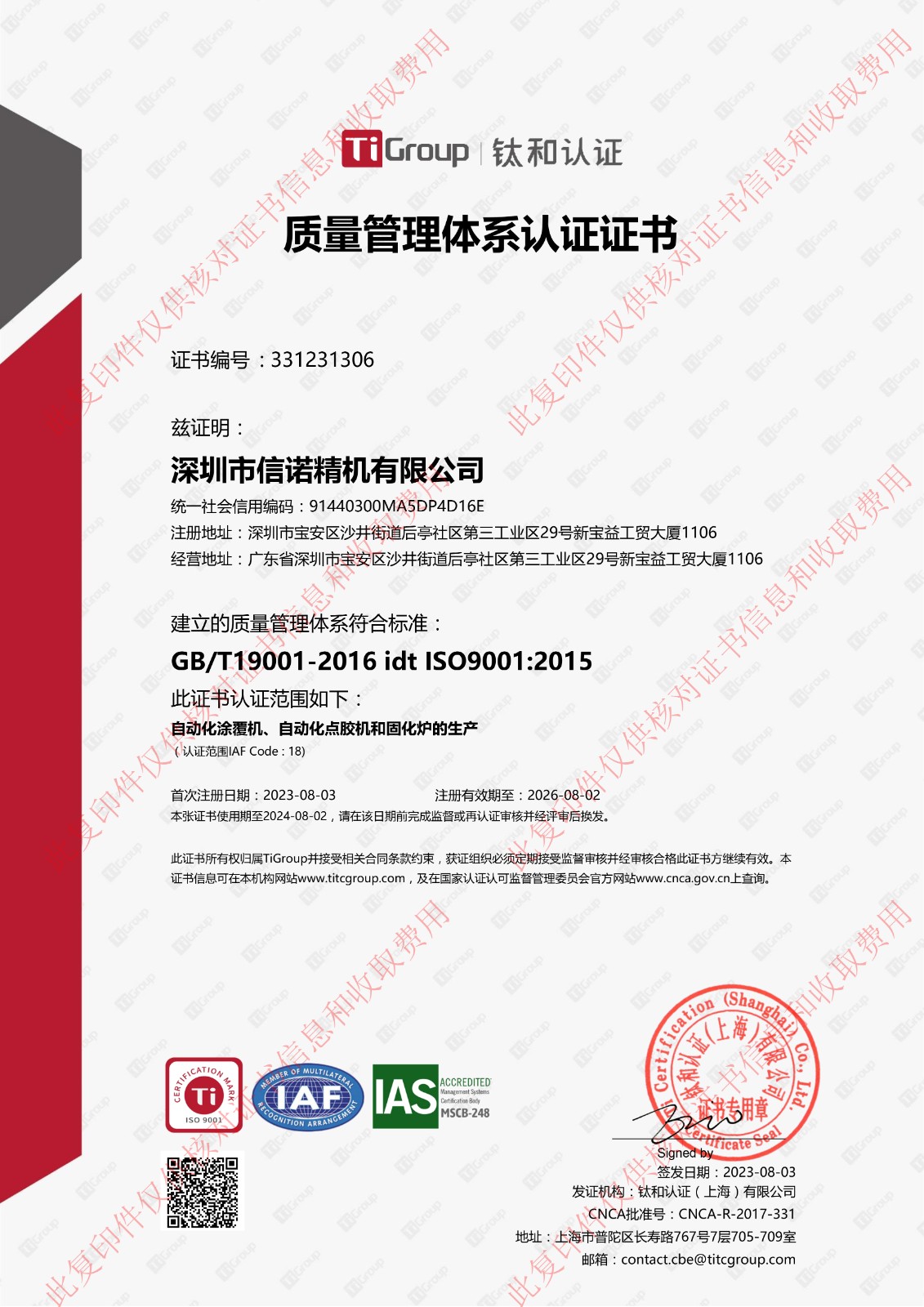 2023年8月信諾榮獲質(zhì)量管理體系認(rèn)證證書
