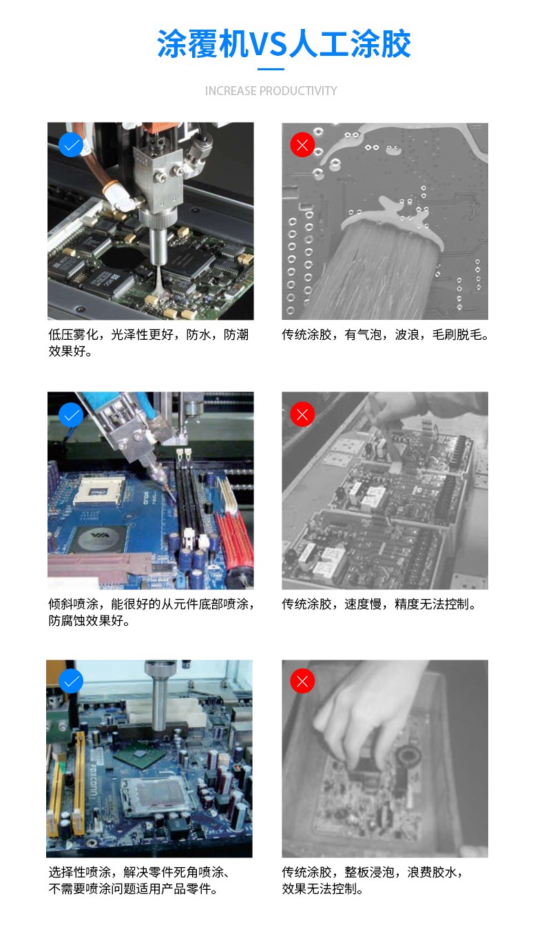 高精度: 選擇性涂覆,均勻準(zhǔn)確,涂覆精度遠(yuǎn)遠(yuǎn)高于人工。